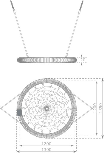 Huśtawka dostępna jest o średnicy 1350 mm. Liny podwieszające zbrojone; na górze łańcuch ze stali nierdzewnej (śr. 6 mm) służący do regulacji wysokości zawieszenia huśtawki. Klamry z wysokiej jakości stali nierdzewnej. Wszystkie zaciski z aluminium. Wysokość montażowa to 2400mm. Siatka siedziska oraz zawiesia z liny zbrojonej śr. 16mm.