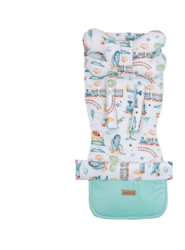 Wkładka posiada 6 otworów na pasy bezpieczeństwa, oraz dwa otwory na zamocowanie poduszki motylka. Wkładki są uniwersalne testowane na wielu wózkach dziecięcych dostępnych na rynku.