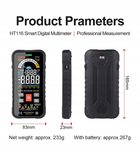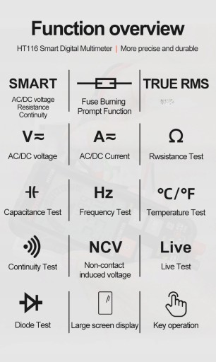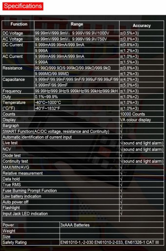 Funkcje pomiarowe: pojemność, bateria, rezystancja, prąd stały, prąd AC, napięcie AC, napięcie DC