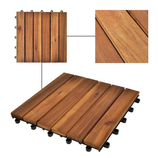 Płytki tarasowe wykonane są z wysokiej jakości drewna akacjowego, tropikalnego drewna liściastego, które jest odporne na warunki atmosferyczne i bardzo trwałe. Dzięki połączeniu wtykowemu płytki można łatwo i szczelnie łączyć, tworząc stabilną powierzchnię do chodzenia.