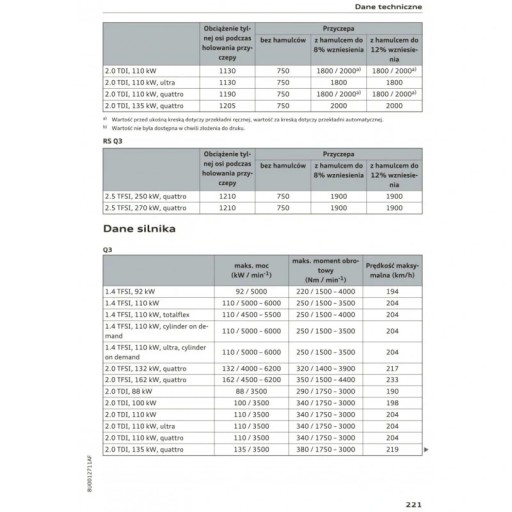 Instrukcja obsługi Audi Audi Q3 po lifcie 2016 - 2018 Q3 oraz RS Q3 Opisywane silniki w tej instrukcji to diesel 2.0 benzyna 1.4 , 2.0 , 2.5 Strony - 232 Stan - nowy Rodzaj - książka Język - polski Edycja - 2017 Okładka - kolor Środek - czarno biały Papier - kreda mat A5 149x210