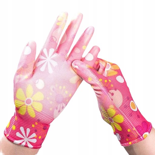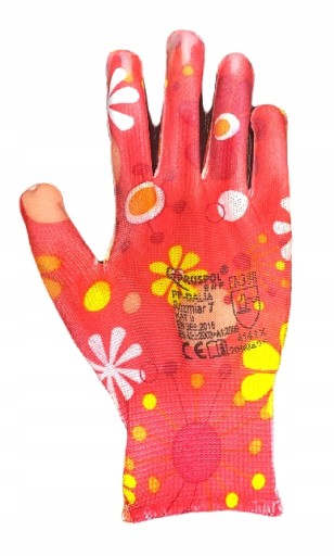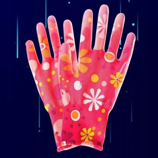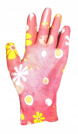 Rękawice robocze, ochronne, damskie, w kwiatowe wzory, poliestrowe, powlekane w części chwytnej poliuretanem - DALIA.
