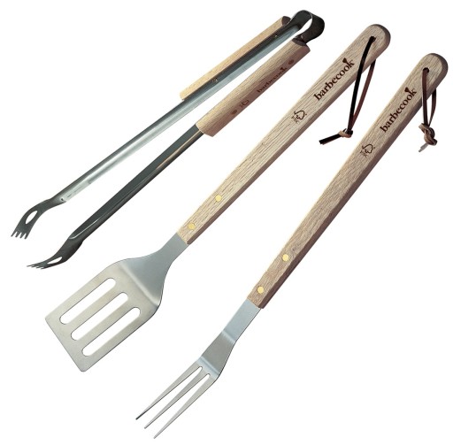 Zestaw narzędzi do grillowania w którego skład wchodzą: łopatka, widelec i szczypce – niezbędnik, każdego miłośnika przyrządzania potraw na grillu.