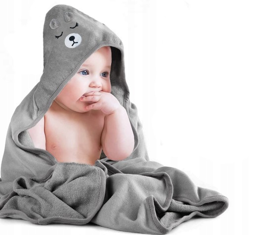 Miły w dotyku i chłonny ręcznik kąpielowy z kapturkiem w kolorze szarym przeznaczony jest dla noworodków jak i starszych dzieci.