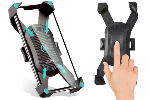 👌 Rozchyl ramiona uchwytu, umieść telefon w jego centralnej części i dociśnij go wciskając tym samym guzik zwalniający blokadę, a ramiona - TYP X - automatycznie zacisną się na rogach Twojego telefonu!