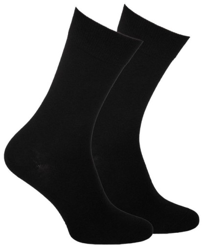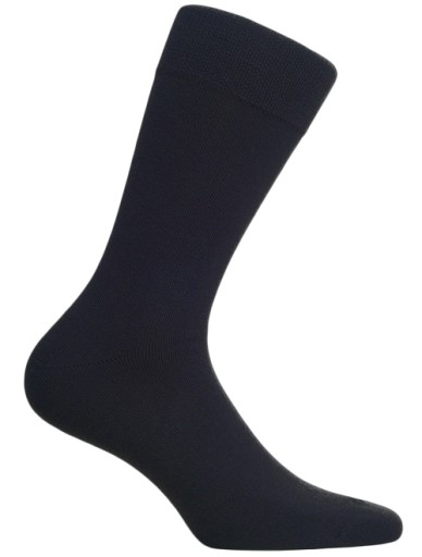 Klasyczne skarpety męskie, gładkie, garniturowe. Wykonane z bawełny z dodatkiem poliestru i elastanu. Posiadają delikatny i nieuciskający ściągacz. Niezwykła delikatność przędzy w połączeniu z nieuciskającym szwem gwarantuje wygodę osobom o wrażliwych stopach.