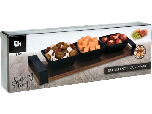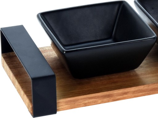 Zestaw 3 kamionkowych miseczek, na tacy z drewna akacjowego - do serwowania oliwek, orzeszków, przekąsek, sosów. Doskonałe również do słodkich mini deserów.