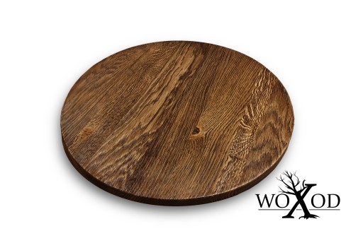 Średnica 90cm a grubość 4cm. Blat jest pokryty powłoką z twardego lakieru który jest odporny na uszkodzenia mechaniczne a jednocześnie pozostawia piękną strukturę drewna.