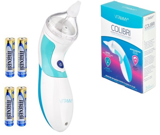 - Skład zestawu: Aspirator Vitammy Colibri, 2 silikonowe końcówki do nosa, 2 baterie typu AA, karta gwarancyjna, instrukcja obsługi w języku polskim.