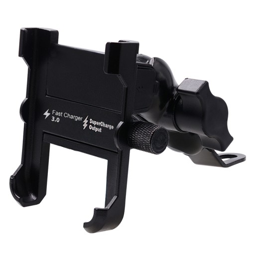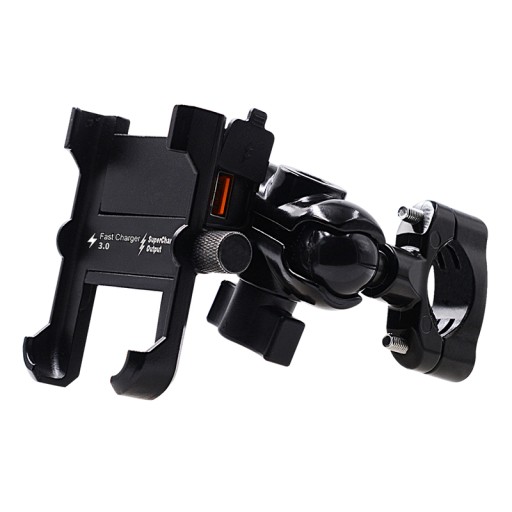 Metalowy uchwyt na telefon montowany do kierownicy. Idealny na motocykl, skuter, quad itp. Wyposażony w ładowarkę USB obsługującą Qualcomm Quick Charge 3.0.
