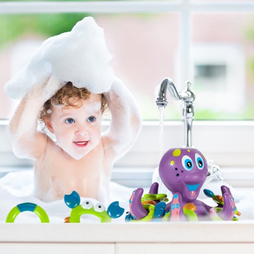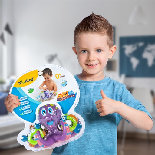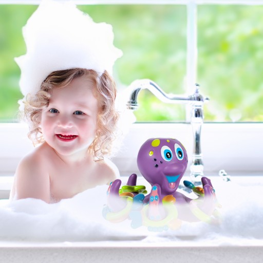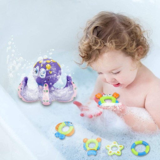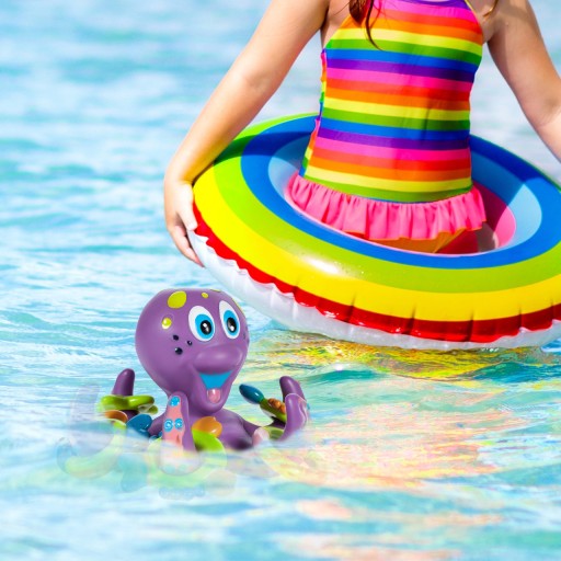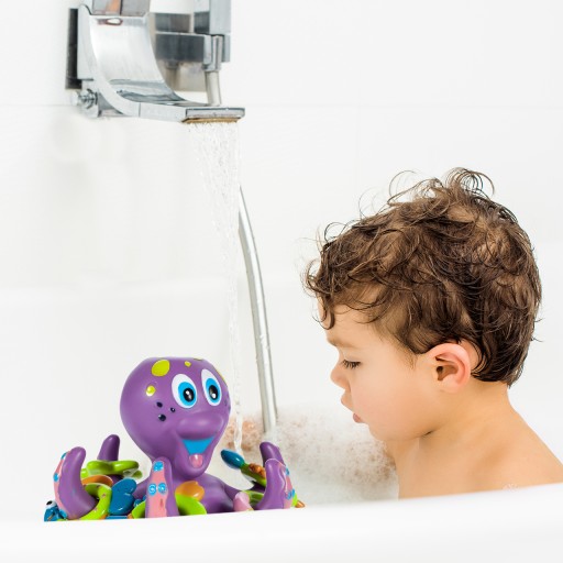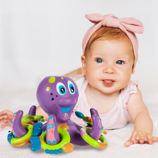 Ośmiorniczka ma sześć ramion, na których można dowolnie zawieszać dołączone w zestawie małe zwierzątka, które unoszą się na wodzie co ułatwia maluszkowi zabawę w wodzie.