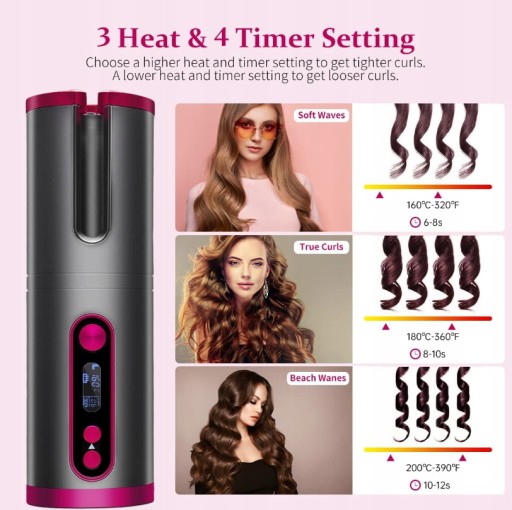 Ustawienia temperatury i czasu Temperatura waha się od 160 stopni C do 200 stopni C, aby dopasować się do różnych rodzajów włosów (niższa temperatura dla łamliwych włosów, wyższa temperatura dla grubych włosów). 6-12 sekundowy automatyczny timer zwijania, który pozwala łatwo tworzyć idealne luźne lub ciasne loki, oszczędzając dużo czasu