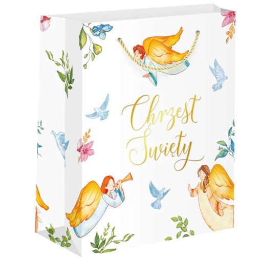 Piękna papierowa torebka na prezenty z okazji chrztu. Torebka jest pięknie ozdobiona pastelowymi motywami, takimi jak aniołki, gołębie i kwiatuszki, które są idealnymi motywami na tę okazję. Dodatkowo złoty napis "Chrzest Święty" oraz wzór kolorowych aniołków dodają eleganckiego, ale również uroczego wyglądu.