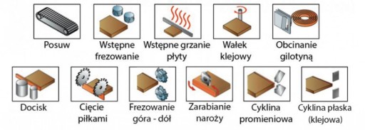 - przyklejenia obrzeża. Dobre wiązanie pomiędzy obrzeżem a płytą zapewnia zespół 2 rolek dociskowych z regulacją siły docisku i odpowiednio skonfigurowanych.