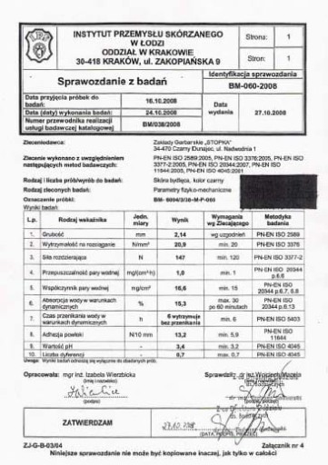 - Certyfikat jakości skóry i membrany
