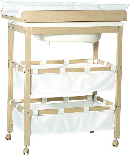 Regał do przewijania z wanienką roba może być przekształcony z przewijaka w stanowisko do pielęgnacji dziecka z wanną w jednym prostym kroku. Dzięki zintegrowanej wannie, kąpanie dziecka jest dziecinnie proste. Nie musisz się już schylać i jesteś bezpośrednio na tej samej wysokości co Twoje dziecko, które możesz bezpiecznie położyć na przewijaku obok wanny po kąpieli. Wąż odpływowy umożliwia łatwy odpływ wody bez konieczności przemieszczania wanny. Wygodna wysokość wynosząca 94 cm jest szczególnie przyjazna dla Twoich pleców. Łatwa w pielęgnacji i odporna na zużycie mata do przewijania z miękko wyściełanymi krawędziami zabezpieczającymi jest pokryta poliuretanem i dlatego jest bardzo wygodna i łatwa w pielęgnacji. Regał zawiera dwa schowki wykonane z wytrzymałego materiału płóciennego do przechowywania wszystkich niezbędnych przyborów do pielęgnacji niemowląt, potrzebnych do wymiany pieluch i kąpieli w zasięgu ręki. Wysuwana cześć regału posiada kółka z hamulcami, które umożliwiają łatwe przemieszczanie i stabilne ustawienie.