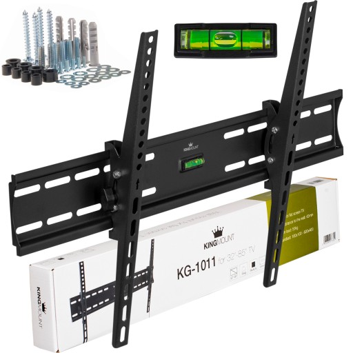- W zestawie uniwersalny komplet śrub montażowych do telewizora oraz komplet wkrętów i kołków do ściany, poziomica