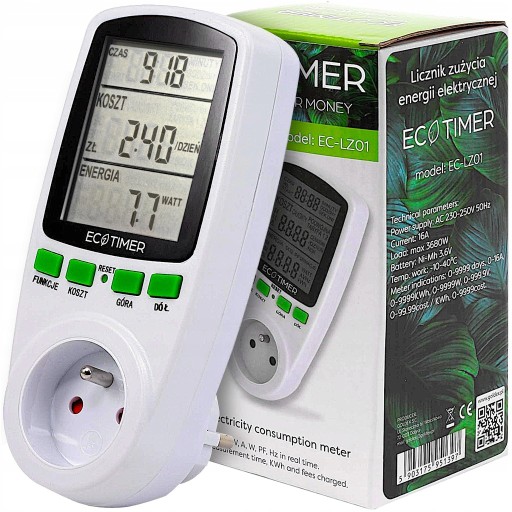 Watomierz pozwala sprawdzić, które urządzenia działają nieekonomicznie - dzięki temu można wprowadzić plan oszczędzania i zredukować wydatki na prąd. Sprawdź ile energii zużywa Twój komputer, telewizor, pralka, ładowarka do telefonu, monitor czy grzejnik elektryczny lub suszarka do ubrań. Miernik mierzy pobieraną energię oraz oblicza jej koszt, podaje zużycie CO2 dla kontrolowanych urządzeń. Wewnętrzny akumulator Ni-Mh 3,6V podtrzymuje ustawienia urządzenia w razie braku prądu.