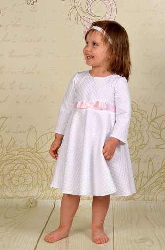 Sukienka do chrztu Hania o prostym i klasycznym kroju, zaś z wyjątkowej tkaniny pikowanej. Nieszablonowa sukieneczka z pewnością przypadnie do gustu małym księżniczkom, gdyż jest bardzo wygodna i miękka. Dodatkowo posiada długi rękawek, dzięki czemu świetnie sprawdzi się w chłodniejsze dni. Delikatna kokarda przewiązana w talii sprawia, że sukieneczka jest jeszcze bardziej czarująca. W naszym salonie znajdziecie również ciepłe rajtuzki oraz buciki, a także idealnie dobrane opaski.