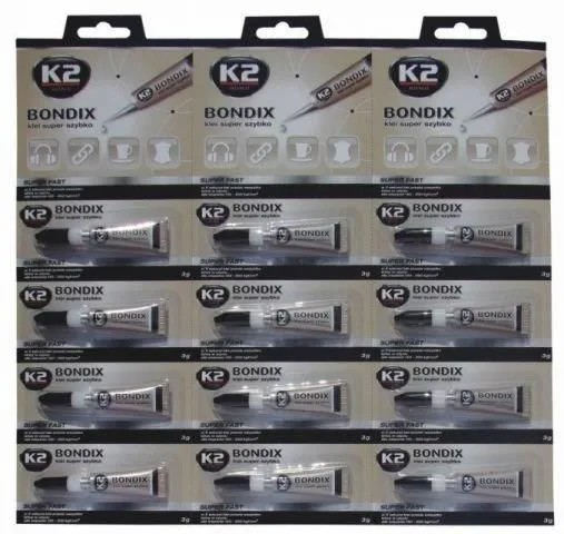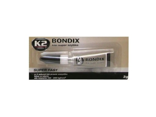 Klej błyskawiczny K2 BONDIX to mocny, jednoskładnikowy, uniwersalny klej cyjanoakrylowy do łączenia elementów z plastiku, metalu, drewna, gumy, skóry, szkła, porcelany czy papieru. Działa ekstremalnie szybko, klejone powierzchnie łączy w 10 do 20 sekund.