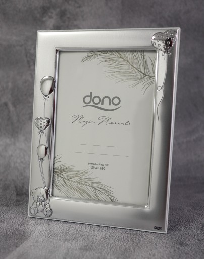 Ramka włoskiej firmy DONO zdobiona emblematami misia z balonikami oraz serduszkiem ( na innej aukcji dostępne zdobienia w kolorze błękitnym oraz różowym )