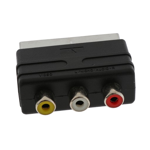 Adapter może być używany do konwersji z 3-wejściowego połączenia phono (czerwony/biały lewy i prawy dźwięk, żółte wejście wideo) na połączenie oparte na Scart .