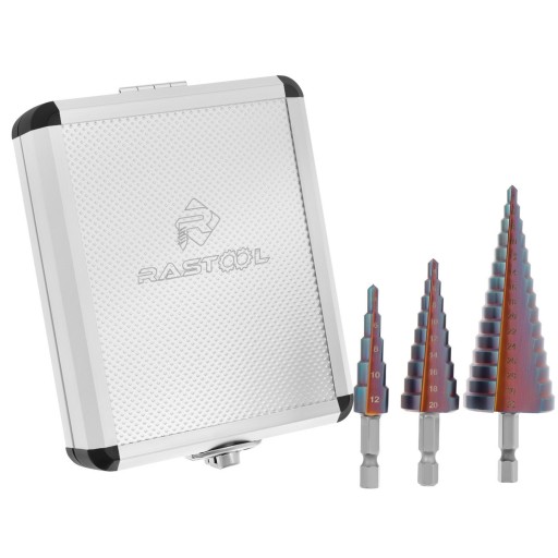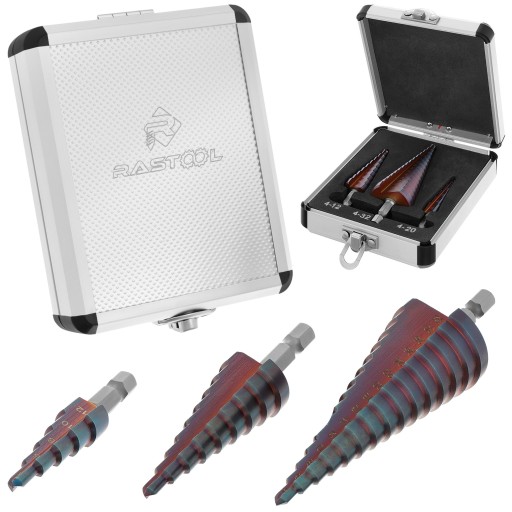Wiertła stopniowe RASTOOL wykonane w najwyższej jakości stali szybkotnącej HSS + 5% Kobaltu (M35). Niezastąpione przy centrowaniu, wierceniu nowych i rozwiercaniu starych otworów. Jakość przemysłowa na najwyższym poziomie.