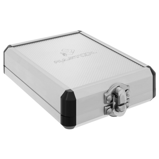 Zestaw umieszczony w aluminiowej walizce transportowej z piankowym wkładem.