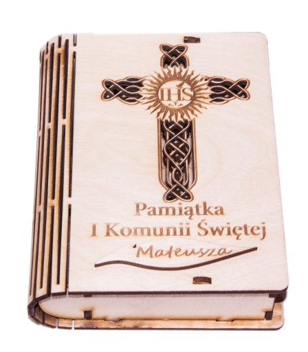 Pudełko drewniane ze sklejki na pieniądze na komunię to piękny i trwały prezent dla dziecka, który pozwoli mu zachować i przechowywać drobne upominki i pieniądze otrzymane z okazji Pierwszej Komunii Świętej.