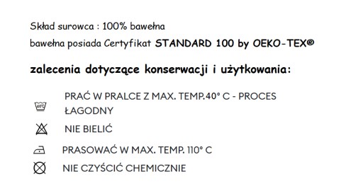 - uszyte z tkaniny 100% bawełnianej spełniającej standardy bezpieczeństwa oraz normy ÖKO-TEX