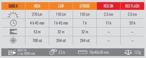 ▪ Tryby pracy: 5 (High, Low, Strobe, Red On, Red Flash)