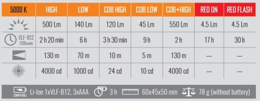▪ Tryby pracy: 7 (High, Low, COB High, COB Low, COB+High, Red On, Red Flash)