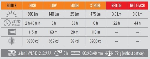 ▪ Tryby pracy: 6 (High, Low, Moon, Strobe, Red On, Red Flash)