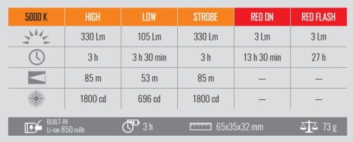 ▪ Tryby pracy: 5 (High, Low, Strobe, Red On, Red Flash)