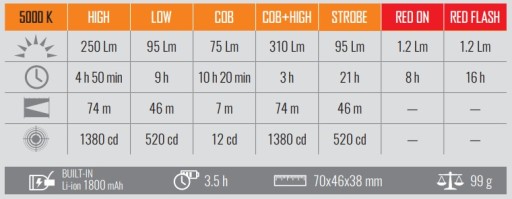 ▪ Tryby pracy: 7 (High, Low, Cob, Cob+High, Strobe, Red On, Red Flash)