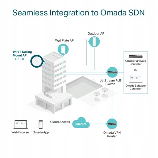 Platforma Omada Software Defined Networking (SDN) integruje ze sobą urządzenia sieciowe takie jak Punkty dostępowe, przełączniki i routery, aby zapewnić w 100% scentralizowane zarządzanie w chmurze i wysoce skalowalną sieć zarządzaną z jednego interfejsu.