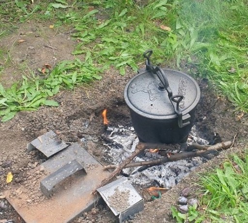 Kociołek może stać bezpośrednio w ognisku lub być zawieszony nad ogniskiem.