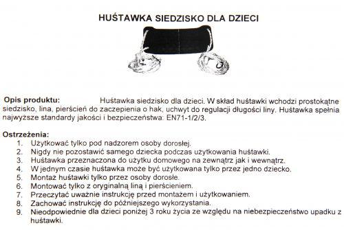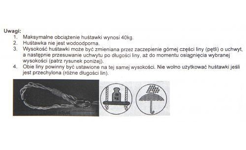 Huśtawka dla dzieci linowa z wygodnym siedziskiem. Posiada solidne liny do montażu z możliwością regulacji wysokości. Zabawa na huśtawce to dla każdego dziecka wspaniała frajda.
