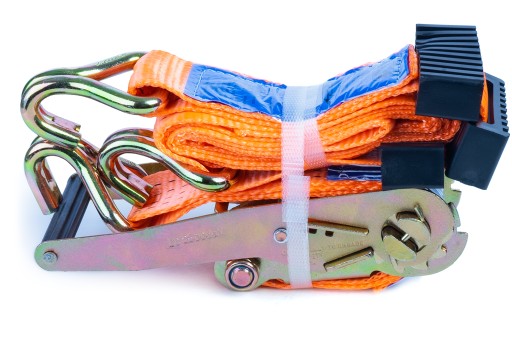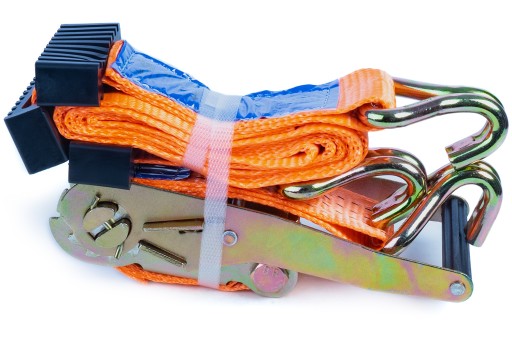 Pasy transportowe z klamrą o długości 3 metrów i wytrzymałości 4 tony w komplecie z ogranicznikami. Cztery pasy transportowe do lawet.