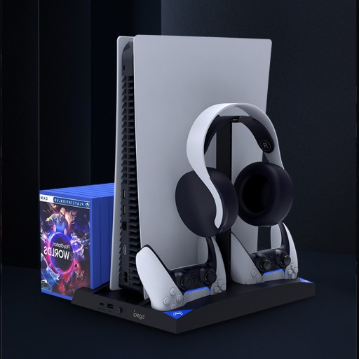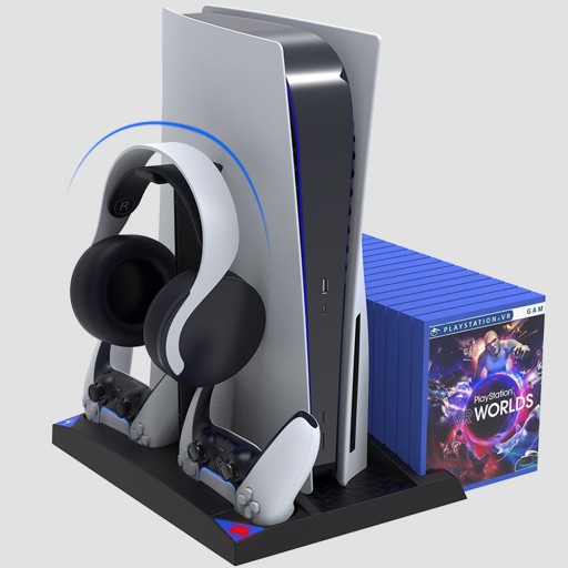 Jeśli jesteś zapalonym graczem i posiadaczem konsoli PlayStation 5 firmy Sony, to ta podstawka na pewno Ci się przyda. Wyposażona w system chłodzenia, stojaki z ładowaniem do padów DualSense, wieszak na słuchawki nauszne oraz przegródki z miejscem na gry. Jest to kompletne rozwiązanie zapewniające porządek przy przechowywaniu urządzenia wraz z jego akcesoriami.