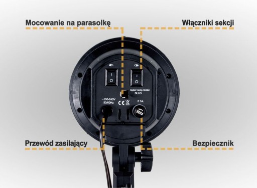 Dzięki czemu zamiast czaszy softboxu można zamontować różnego rodzaju parasolki fotograficzne (dyfuzyjna, odbijająca). Zwiększa to dodatkowo możliwości modyfikowania światła. Do softboxu można zamontować maksymalnie cztery żarówki o maksymalnej mocy 85W każda. Włączniki na obudowie softboxu umożliwiają regulację mocy poprzez włączanie/wyłączanie par żarówek (dwa włączniki): 0%-50%-100%. Zestaw mocuje na statywie oświetleniowym, który umożliwia dowolną regulację kąta nachylenia. W komplecie kabel zasilający. Urządzenie posiada bezpiecznik.