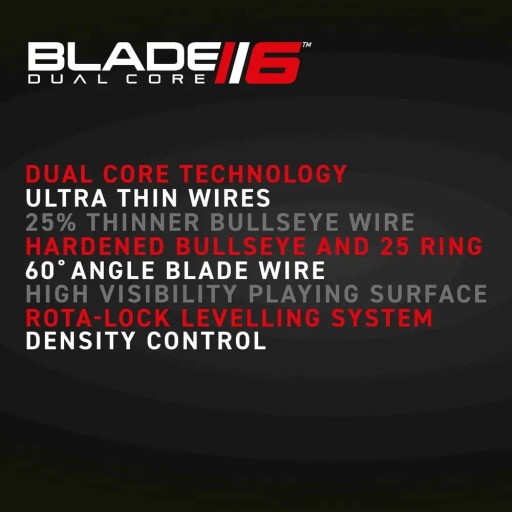 Pionierska konstrukcja sieci Blade zawiera najnowszy drut „Density Control™” zapewniający optymalną gęstość włókien i lepsze utrzymywanie rzutek w strefach podwójnej, potrójnej i dziesiątej, dla maksymalnej siły punktacji.