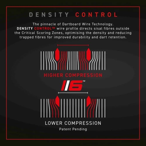 Niezwykle cienki drut o kącie 60 ° odchyla rzutki w obszar punktacji, zapewniając absolutnie minimalne odbicia. W pełni utwardzona tarcza i zewnętrzny byk, wyposażone w drut „Density Control™”, są teraz o 25% cieńsze.