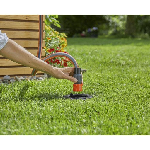 Połączenie kranu z instalacjami Pipeline oraz Sprinklersystem jest wygodne i bezpieczne. Kulista pokrywa chowa się po otwarciu w puszce podłączeniowej, dzięki czemu nie utrudnia koszenia trawnika.