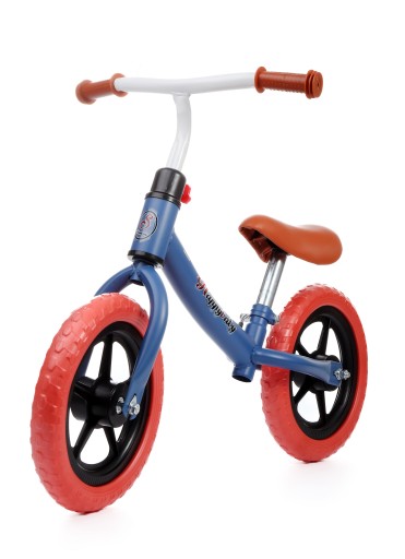Niebieski dwukołowy rowerek biegowy Webben FOX-03 dla chłopca i dziewczynki. Czerwone koła z pianki EVA.