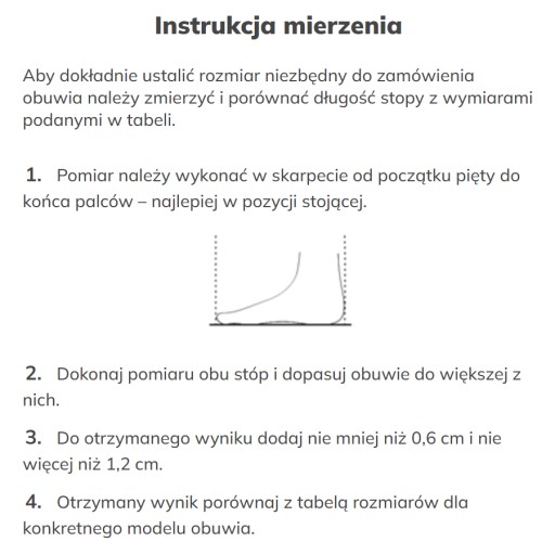 - Otrzymany wynik porównaj z tabelą rozmiarów dla konkretnego modelu obuwia.