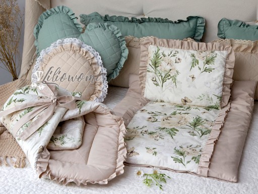 - W skład kompletu wchodzi także półokrągła PODUSIA Z FALBANKĄ.