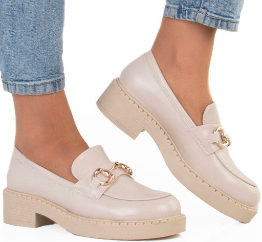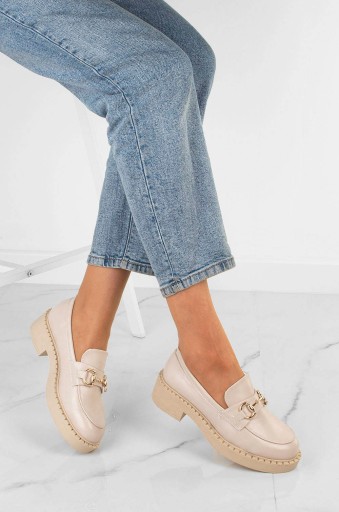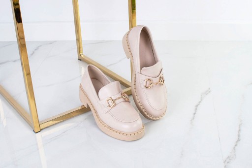 Wyjątkowe mokasyny ze skóry ekologicznej na profilowanej, wygodnej podeszwie. Piękny kolor w odcieniu beżowym oraz ozdobny łańcuch na przodzie buta. Model solidnie i starannie wykonany z najwyższej jakości materiałów. Obuwie idealne do tworzenia najmodniejszych stylizacji!