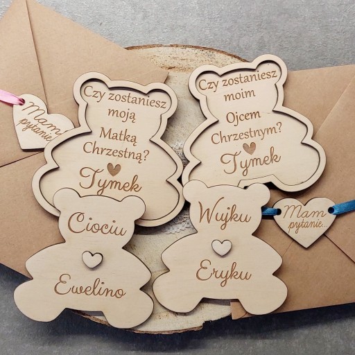 - Drewniana karta zaproszenia (miś o wymiarach około 10 x 10 cm) " Ze spersonalizowanym napisem (należy podać imiona chrzestnych) np. "Ciociu Karolinko" , "Wujku Marcinie" itd.