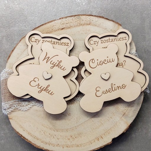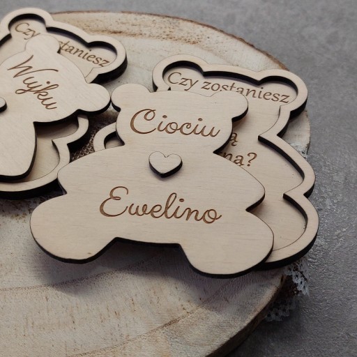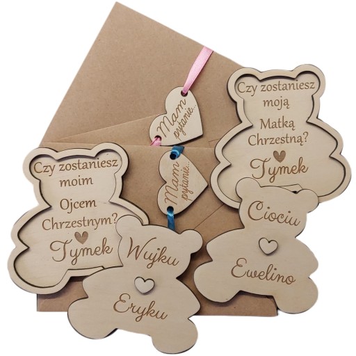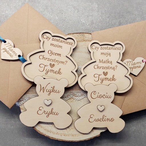 - Drewniana karta zaproszenia (miś o wymiarach około 10 x 10 cm) " Ze spersonalizowanym napisem (należy podać imiona chrzestnych) np. "Ciociu Karolinko" , "Wujku Marcinie" itd.